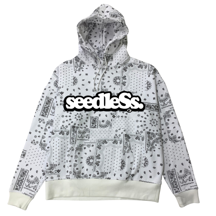 ペイズリー柄の裏起毛のスエット生地のビックサイズhoody。胸と背中には2色のロゴがプリントで入ります。pt02とセットアップも可能です。