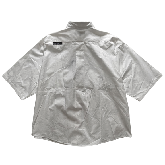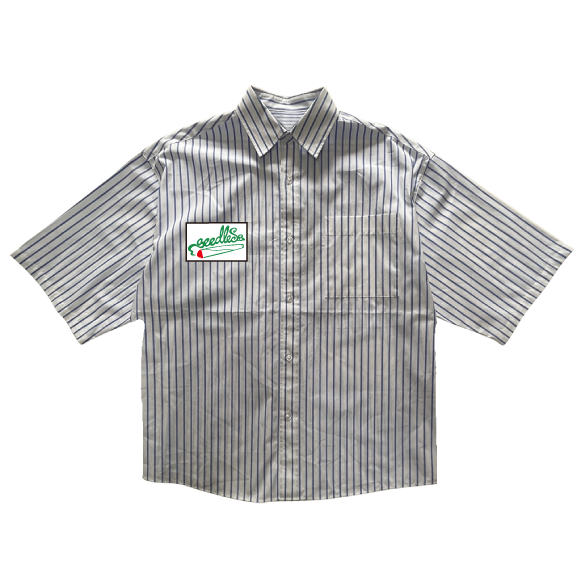 綿100%のブロード生地のビックシルエット。肌さわりも良い綺麗めなさわやかシャツです。胸にはジョイントロゴのワッペンが背中にはピスネームが付きます。