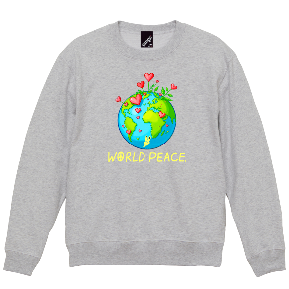 緑と青の地球にハートの花が咲くグラフィック。願うはWorld Peace。10ozの裏毛生地。 おすすめのスエツトです!! サイズスペック 着丈:M67cm, L71cm, XL76cm,XXL81cm 身幅:M55cm, L58cm, XL63cm,XXL68cm