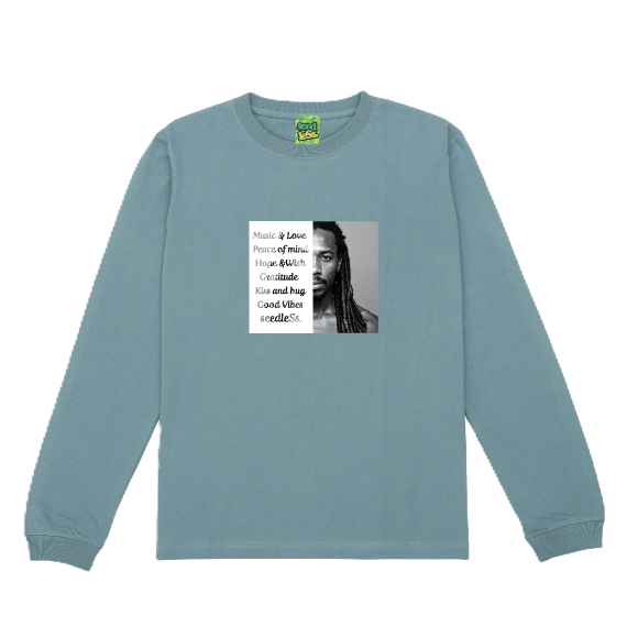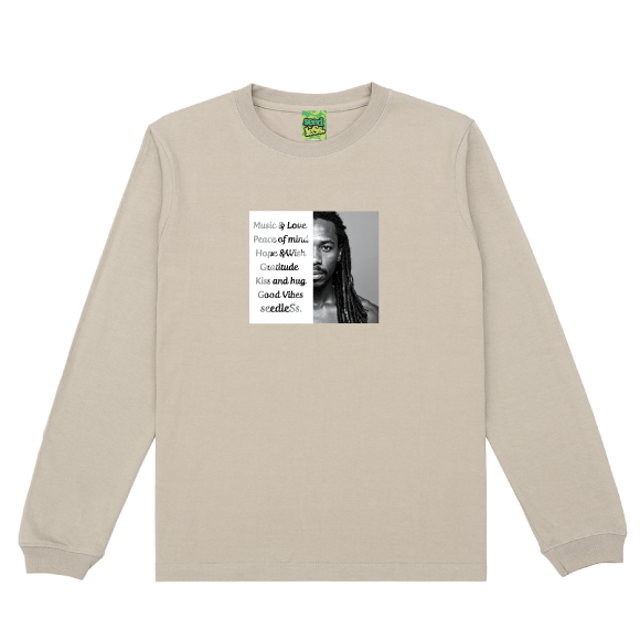 Gratitude, peace of mind, kiss & hugなどGood vibrationなワードが入るメッセージロンT。