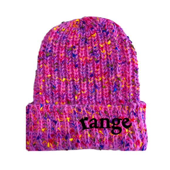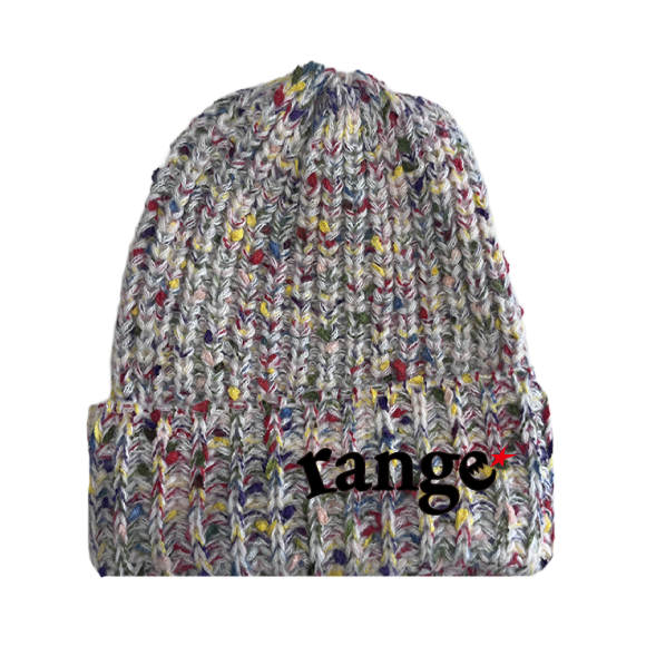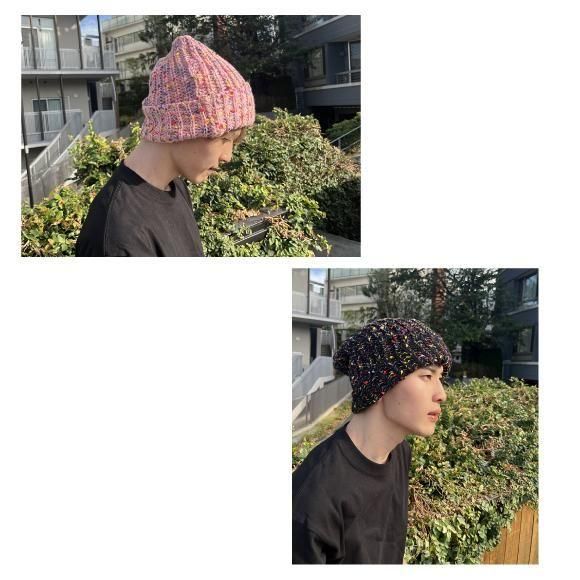 ざっくり感のある糸にカラフルなビーズのようなチップが入ったビーニー。男女どちらでも似合います。ロゴは刺繍。おすすめです!!