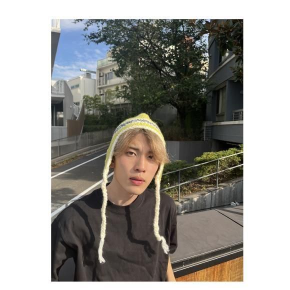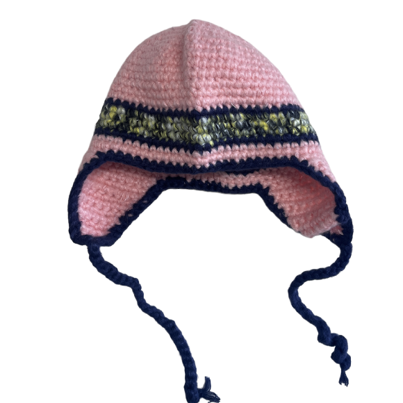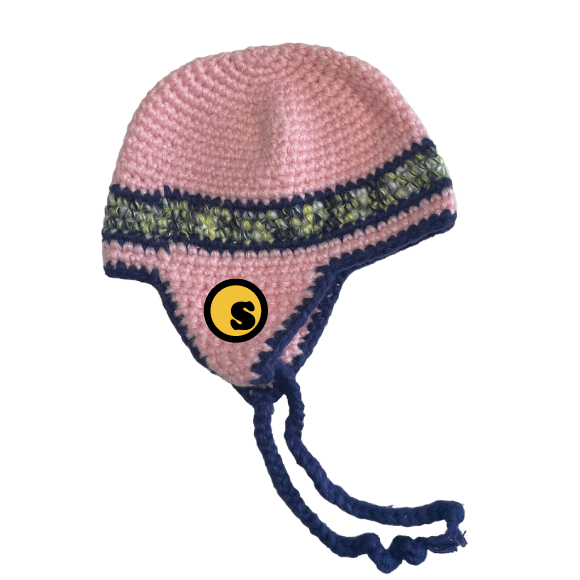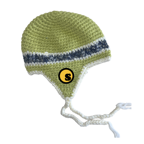 固めに編み込んだ太めの糸の耳当て付きビーニー。2色ロゴは刺繍。おすすめ